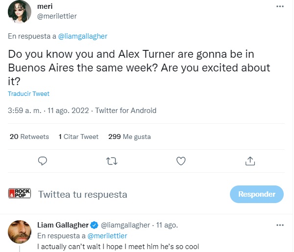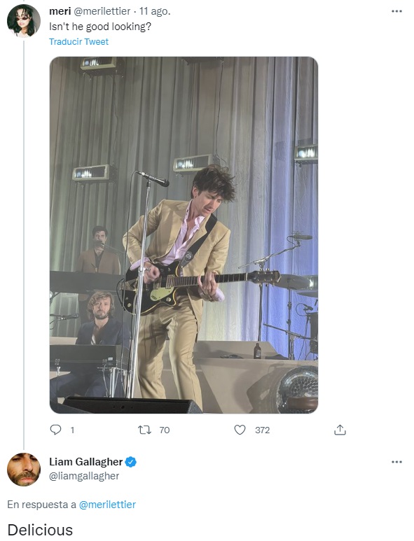 Sin embargo, lo que más llamó la atención fue su cumplido al líder de la banda. "¿Acaso no es apuesto?", le preguntó una fanática a Liam Gallagher, con una foto de Alex Turner en su concierto de regreso. "Delicioso", le respondió Liam en un tweet que se viralizó.