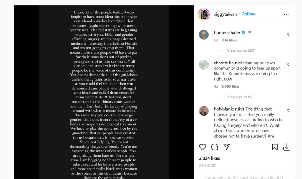 “Lo que no entiendes es que las mujeres y los hombres trans binarios no pueden darse el lujo de jugar con lo que significa ser trans de la misma manera que tú”. Continuó la publicación.