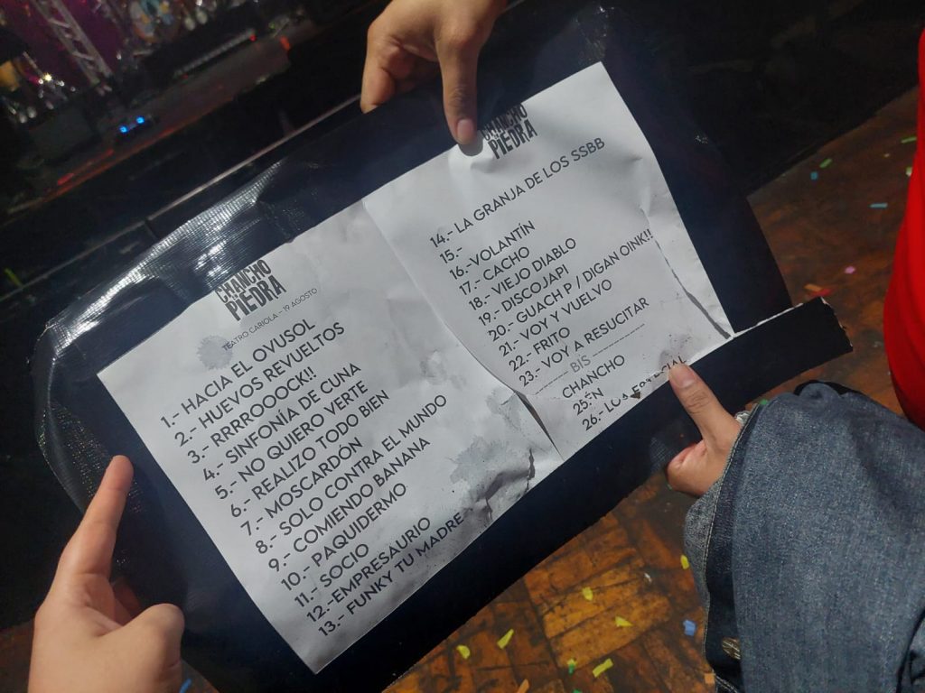 La euforia fue total, y al terminar el shows un gran grupo de marranos se juntó tras la reja para rescatar alguno de los setlist de la banda. Fue en ese momento que logramos presenciar un momento especial. Un seguidor de la banda, que creció escuchando a los Chanchos tomó el último setlist de la noche del 19 de agosto.
