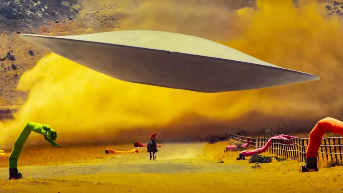 La mayor revelación de Nope es que la gran figura del cielo no se trata realmente de una nave espacial con enanitos verdes dentro de ella. Este "platillo" es la criatura como tal: Un brutal depredador que se alimenta de animales y seres humanos.