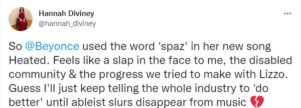 Sin embargo, la interprete se disculpó y actualizó la canción para no incluir esta palabra. Por esto, la usuaria señaló que la situación de Beyoncé se siente como un retroceso del "progreso que habíamos logrando con Lizzo".
