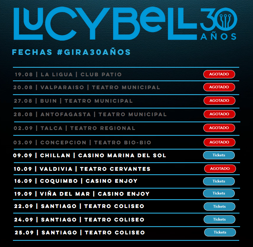 La primera serie de conciertos conmemorativos contempla 13 fechas, cuatro de las cuales ya agotaron sus tickets disponibles. Además de La Ligua y Valparaíso, el viaje de festejo de Lucybell incluye también a Buin, Antofagasta, Talca, Concepción, Chillán, Valdivia, Coquimbo, Viña del Mar y tres presentaciones en Santiago.