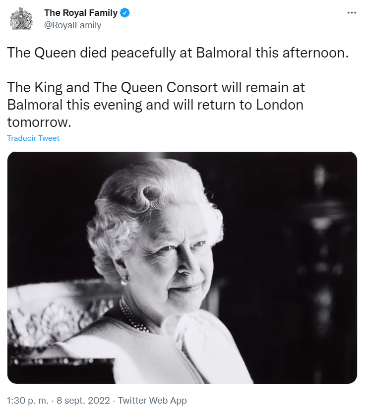 "La Reina murió pacíficamente en Balmoral esta tarde. El Rey (Carlos) y la Reina Consorte permanecerán en Balmoral esta noche y regresarán a Londres mañana". Escribieron, sin revelar mayor información al respecto.