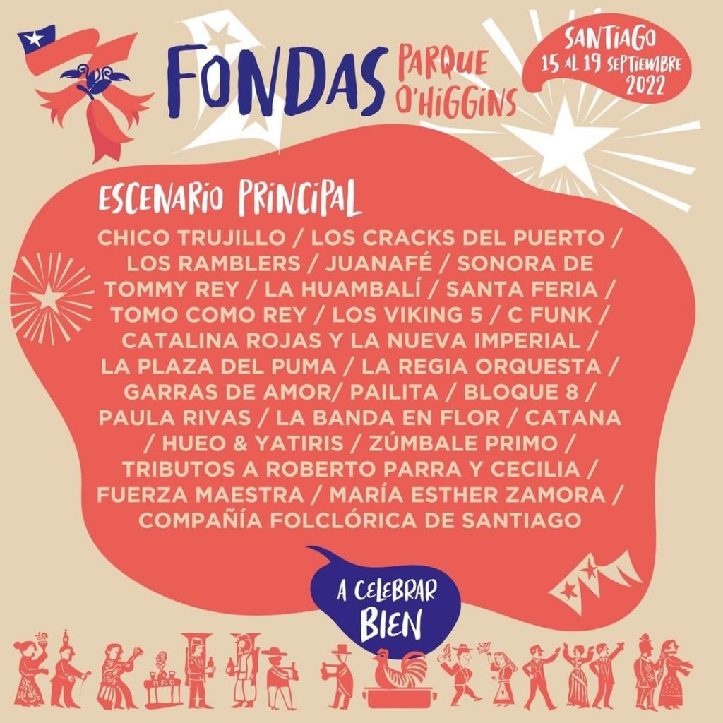 Las típicas fondas del Parque OHiggins también van a estar abiertas este 2022. Desarrollándose entre el jueves 15 y el lunes 19 de septiembre. Contará con más de 60 shows, entre los que destacan Pailita, La Sonora de Tommy Rey, Chico Trujillo, e incluso un tributo a Cecilia y Roberto Parra.