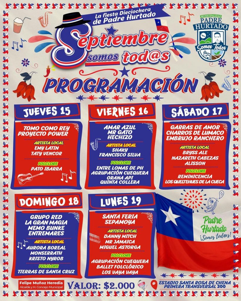 Entre el jueves 15 y 19 de septiembre, la comuna de Padre Hurtado tendrán diversas presentaciones musicales en el Estadio Santa Rosa de Chena. Cuyas entradas tienen un valor de $2.000 pesos.