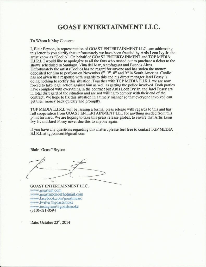 “El señor Artis Ivey a.k.a Coolio, se ha robado el dinero equivalente al depósito enviado toda la gira sudamericana, además de una fecha en México y Ucrania”. Añadió la empresa organizadora en ese momento.