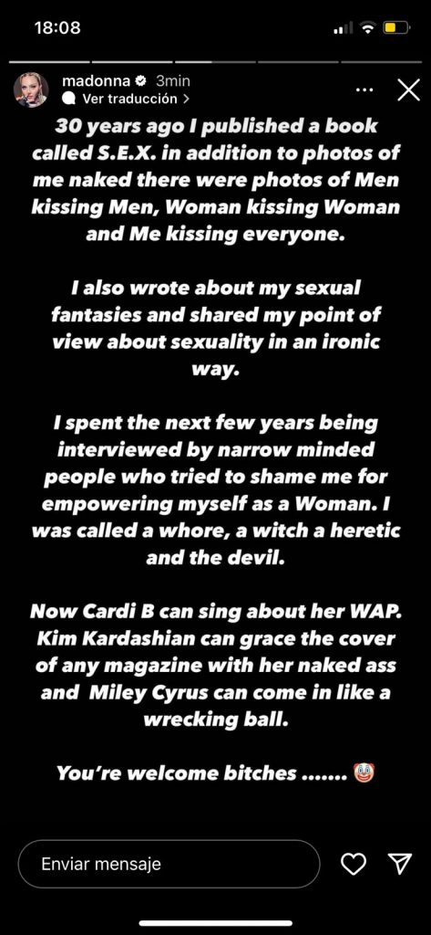 “Hace 30 años publiqué un libro llamado Sex, y además de fotos mías desnuda, había fotos de hombres besando a hombres, mujeres besando a mujeres y yo besando a todos”, comenzó escribiendo. “Pasé los siguientes años siendo entrevistada por personas de mente estrecha que intentaron avergonzarme por empoderarme como mujer. Me llamaron puta, bruja, hereje y diablo”.