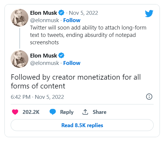 "Twitter pronto agregará la capacidad de adjuntar texto de formato largo a los tweets". Dijo. "Seguido por la monetización del creador para todas las formas de contenido".