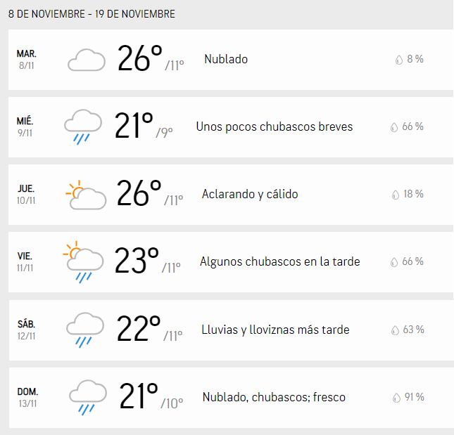 A continuación, te dejamos el pronóstico del tiempo y lluvias en Santiago para el resto de la semana a continuación. Correspondiente a los días martes, miércoles, jueves, viernes, sábado y domingo: