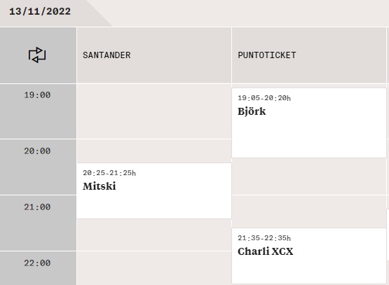 A las 19:05 horas, Björk se tomará el escenario Puntoticket, uno de los principales de la primera versión del festival. La legendaria artista tendrá un show de más de una hora, que debería terminar a eso de las 20:20 horas de este domingo 13 de noviembre.