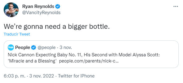 "Vamos a necesitar una botella más grande (para celebrar)", escribió Ryan Reynolds en su cuenta de Twitter.