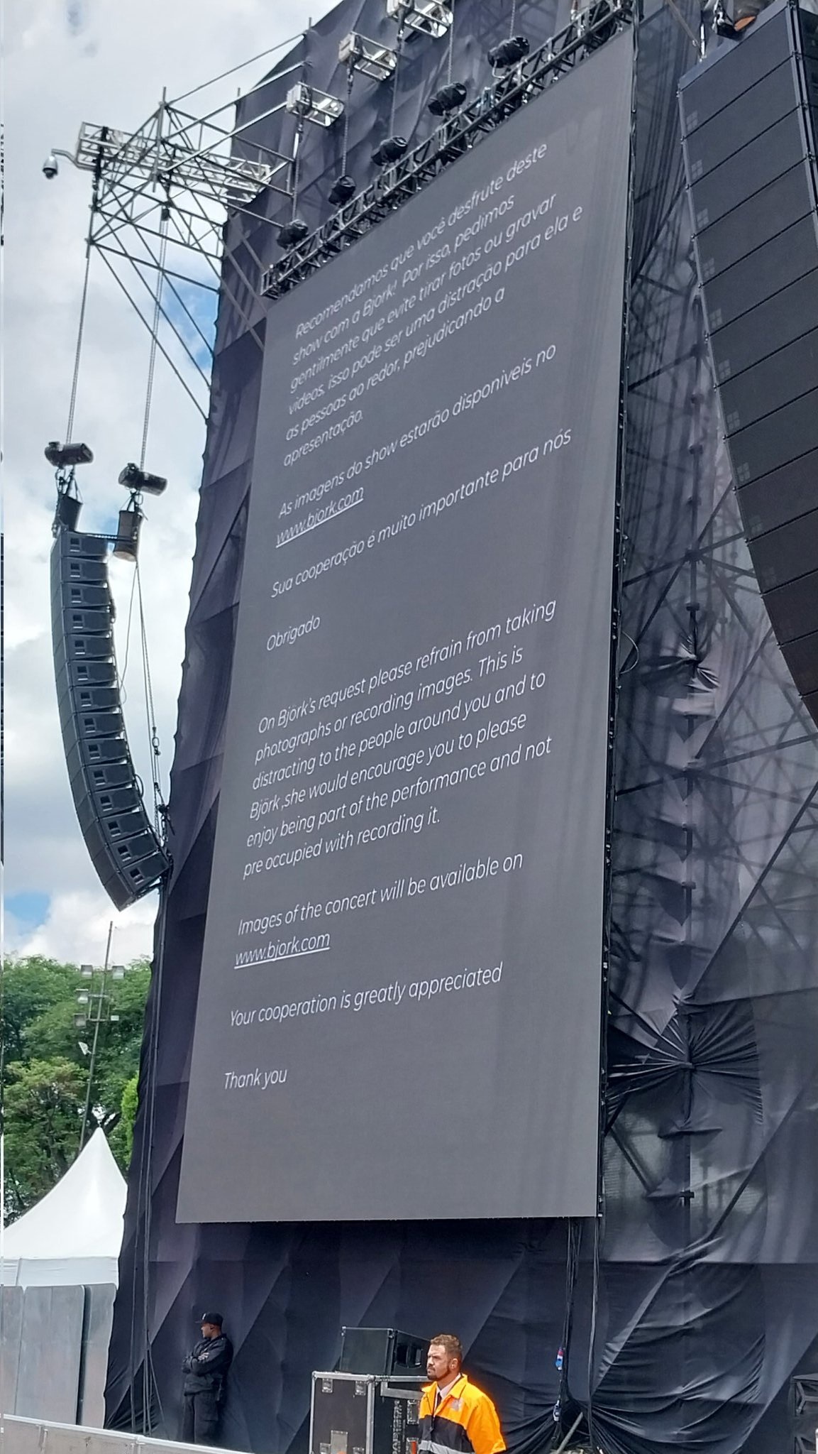 "A petición de Björk, por favor abstenganse de tomar fotos o de grabar videos. Esto distrae a las personas a su alrededor y a Björk. Ella los anima a disfrutar la presentación y no preocuparse por grabarla", señaló el comunicado que se proyectó en las pantallas.