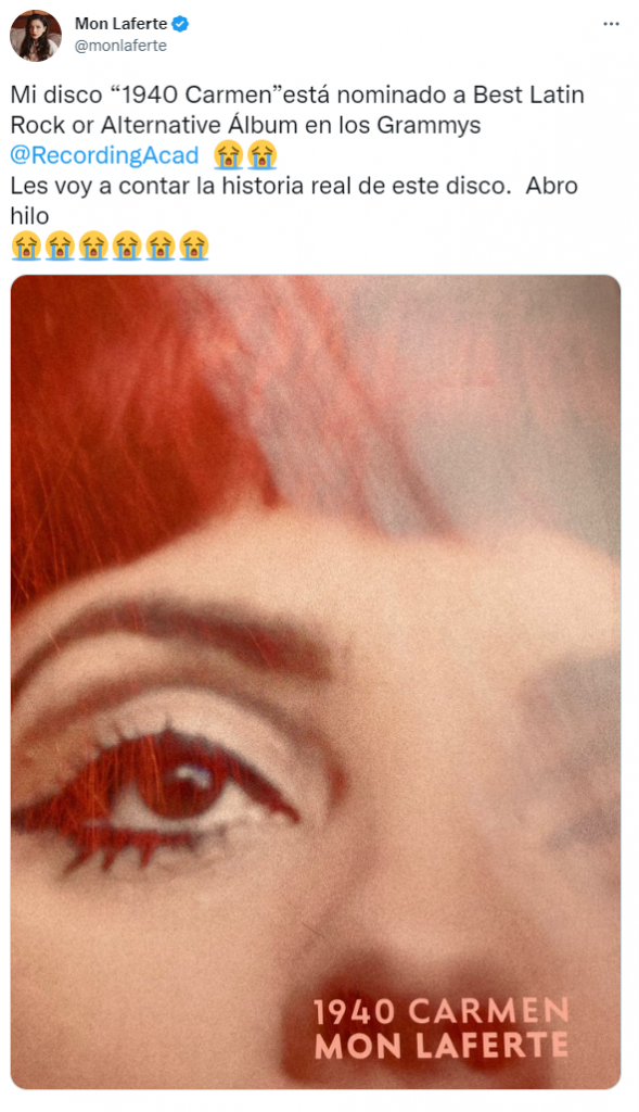 Mon Laferte también dijo que 1940 Carmen, álbum nominado a los Premios Grammy 2023, se hizo en un “estudio de grabación casero en el pequeño depa en el que estábamos viviendo (la dirección era 1940 Carmen, en Hollywood)”.