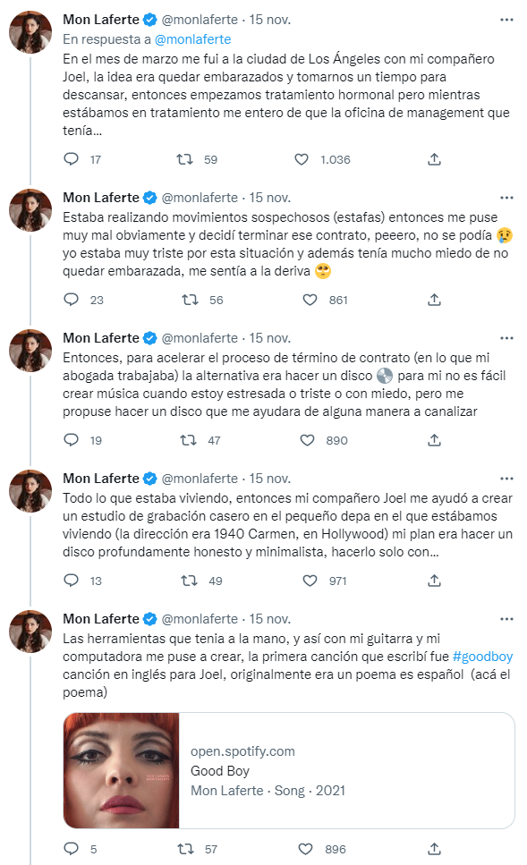 “En el mes de marzo me fui a la ciudad de Los Ángeles (Estados Unidos) con mi compañero Joel, la idea era quedar embarazados y tomarnos un tiempo para descansar, entonces empezamos un tratamiento hormonal, pero mientras estábamos en tratamiento me entero que la oficina de management que tenía, estaba realizando movimientos sospechosos (estafas)”. Comenzó a decir Mon Laferte en una publicación.