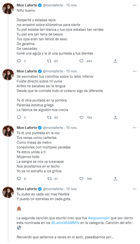 Y añadió: “Eso lo puse en esta canción que escribí en inglés (no sé inglés), pero como me da vergüenza decirlo en español, es mejor así para mí. Con este tuit me libero de alguna manera”.