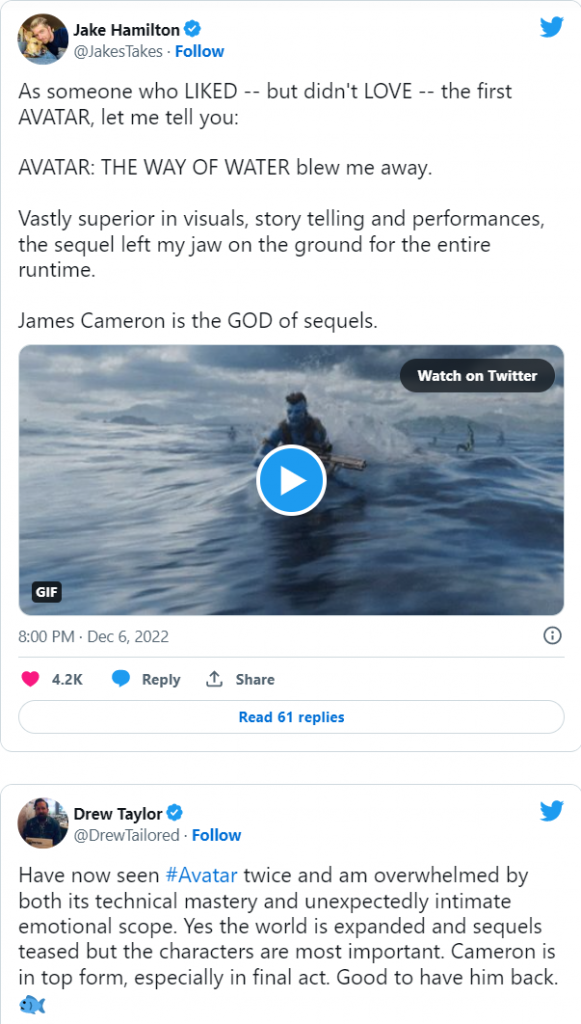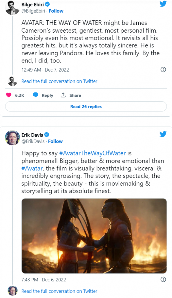 Tras el estreno, las reacciones de los críticos a Avatar 2 fueron igualmente efusivas. Josh Horowitz escribió. “James Cameron muestra una vez más a los cineastas cómo se hace. Lo he dicho mil veces. Nunca dudes de él. Avatar 2: The Way Of Water es la forma de hacer un éxito de taquilla épico. Emotivo, visceral y tan grande como las películas".