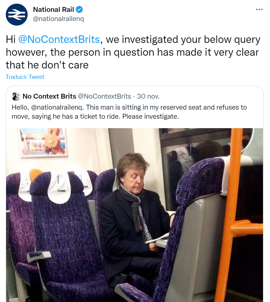 La empresa ferroviaria National Rail respondió a una "queja" viral sobre Paul McCartney de The Beatles supuestamente ocupando el asiento reservado de un cliente en un tren.