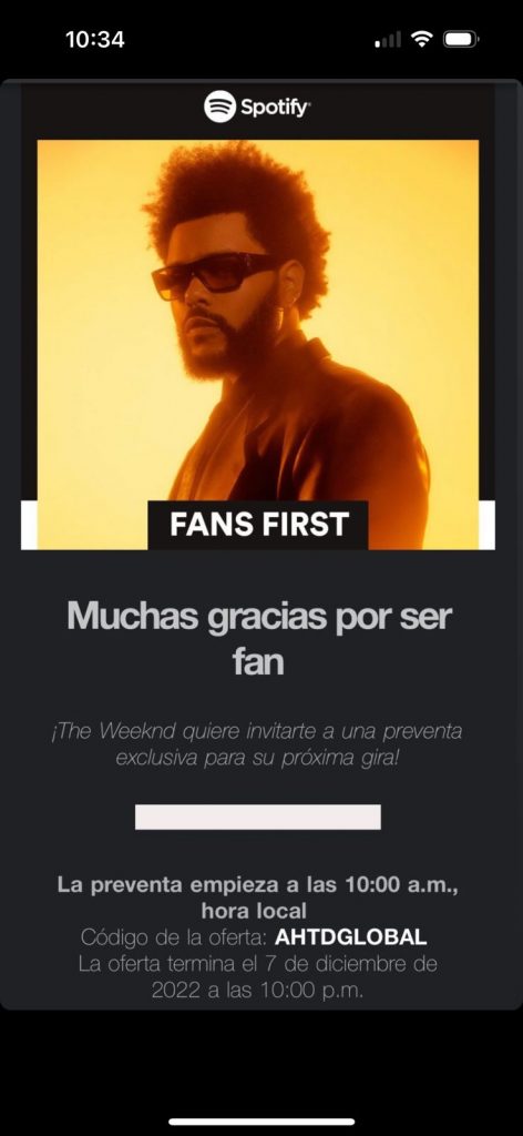 Pese a todo, los usuarios de Spotify que se han reproducido muchísimo a al artista en la plataforma, recibieron un sorpresivo correo en la que se detalla lo siguiente: "Fans First (los fanáticos primero). Muchas gracias por ser fan. ¡The Weeknd quiere invitarte a una preventa exclusiva para su nueva gira!".