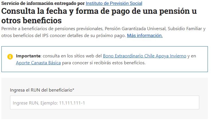 Chile Atiende cuenta con un buscador que permite saber el día y la forma en que se hará efectivo el pago de cualquier beneficio social, tales como los bonos del IPS, y solo consultando con el RUT.