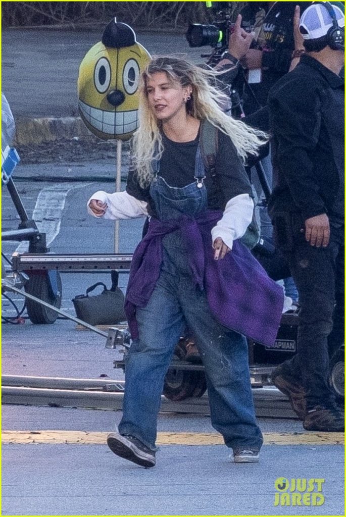 A Millie Bobby Brown la vieron con un overol de gran tamaño, una camisa de franela morada y una mochila mientras grababa junto con un robot suplente.