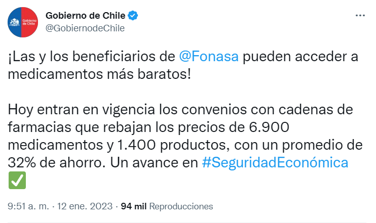 El jueves 12 de enero finalmente entró en vigencia el convenio que entrega medicamentos con descuento, en ciertas farmacias, a los usuarios del Fondo Nacional de Salud (Fonasa), y esta iniciativa es parte del plan de Seguridad Económica del Presidente de la República, Gabriel Boric, el cual contiene siete ayudas económicas dirigidas a las familias.