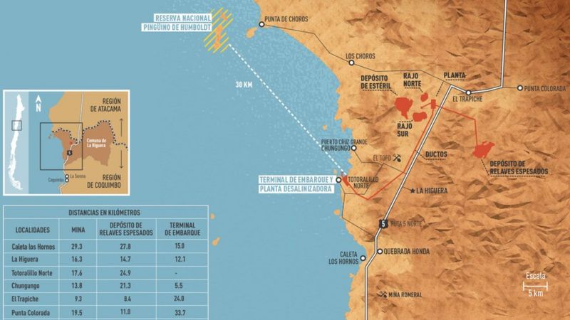 De acuerdo a lo que planeaba la propia empresa, la iniciativa iba a estar conectada con el terminal de embarque en el borde costero a través de tres ductos subterráneos de 26 kilómetros. Los que llevarían tanto agua como hierro por sus canales, y esto con una proyección de 22 años de operación.