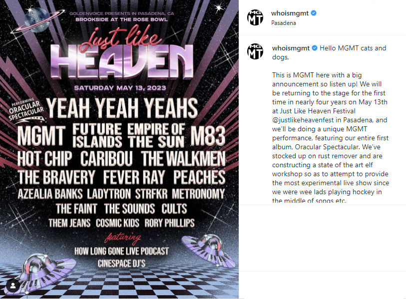 “Regresaremos al escenario por primera vez en casi cuatro años el 13 de mayo en el Festival Just Like Heaven en Pasadena, y haremos una presentación única de MGMT, presentando todo nuestro primer álbum, Oracular Spectacular ”. Escribieron en Instagram.