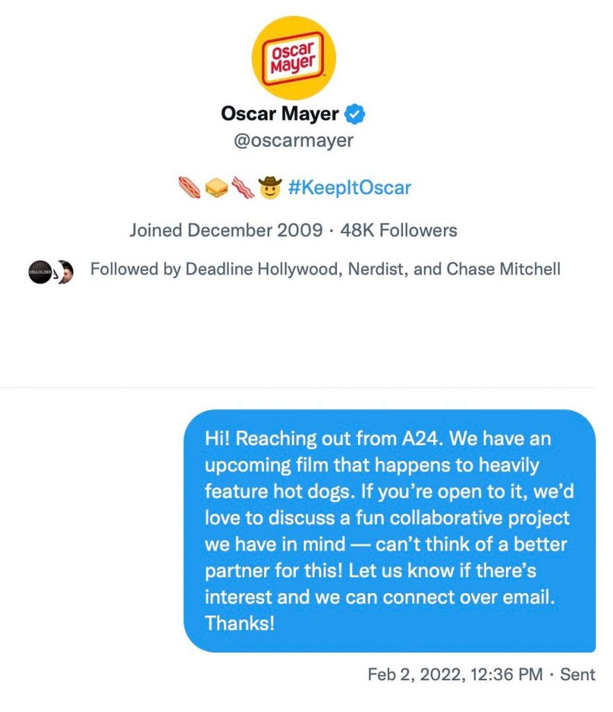 En febrero de 2022, A24 contactó a Oscar Mayer sobre una posible colaboración entre ambos. Esto para una "próxima película que presenta muchos hot dogs".
