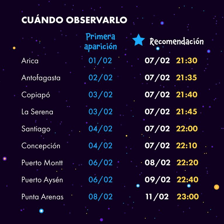 Desde este 7 de febrero el cometa verde será visible desde Arica hasta Concepción, y para observarlo solo necesitas de un telescopio pequeño o binoculares astronómico. Conoce los horarios en el siguiente grafico realizado por el Centro de Astrofísica y Tecnologías Afines (CATA).