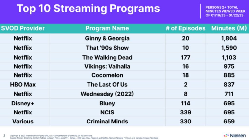 Según los datos de Nielsen, The Last of Us figura en sexto lugar de las series más vistas dentro de las plataformas de streaming, con un total de 837 millones de minutos vistos. Además, la serie actualmente es la única de la plataforma que figura en el listado, ya que el resto de las series son originarias en su mayoría del gigante del streaming, Netflix.