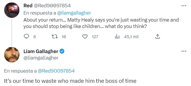 "Es nuestro tiempo para perder. ¿Quién te hizo el jefe del tiempo?", escribió Liam Gallagher en una respuesta típica de él. Curiosamente, es Liam el que se ha mostrado más abierto a una reunión de Oasis, mientras que Noel ha señalado que solo lo haría por una enorme cifra de dinero.