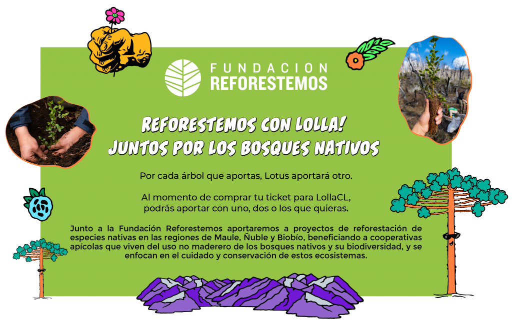 ¡Reforestemos con Lolla! Juntos por los bosques nativos, es una iniciativa que se realiza en conjunto con la Fundación Reforestemos y que busca apoyar a los proyectos de reforestación de especies nativas en las regiones del Maule, Ñuble y Biobío.