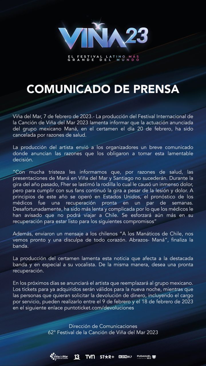 "La producción del Festival Internacional de la Canción de Viña del Mar 2023 lamenta informar que la actuación anunciada del grupo mexicano Maná, en el certamen el dia 21 de febrero, ha sido cancelada por razones de salud" señaló la organización.