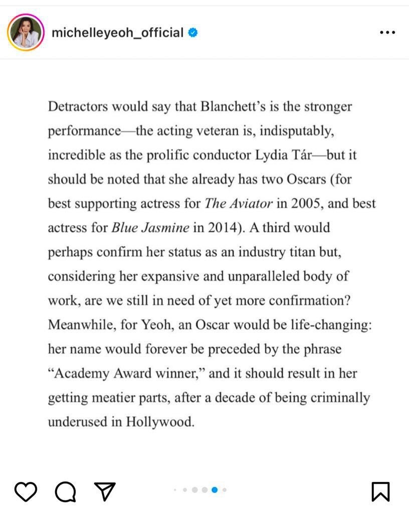 Sin embargo, la publicación también incluía un texto que mencionaba que Cate Blanchett ya tiene dos Oscar en su carrera y que no "necesita" otro, mientras que un Oscar para Yeoh sería bastante especial. Aunque ella no lo escribió, sí causó polémica.