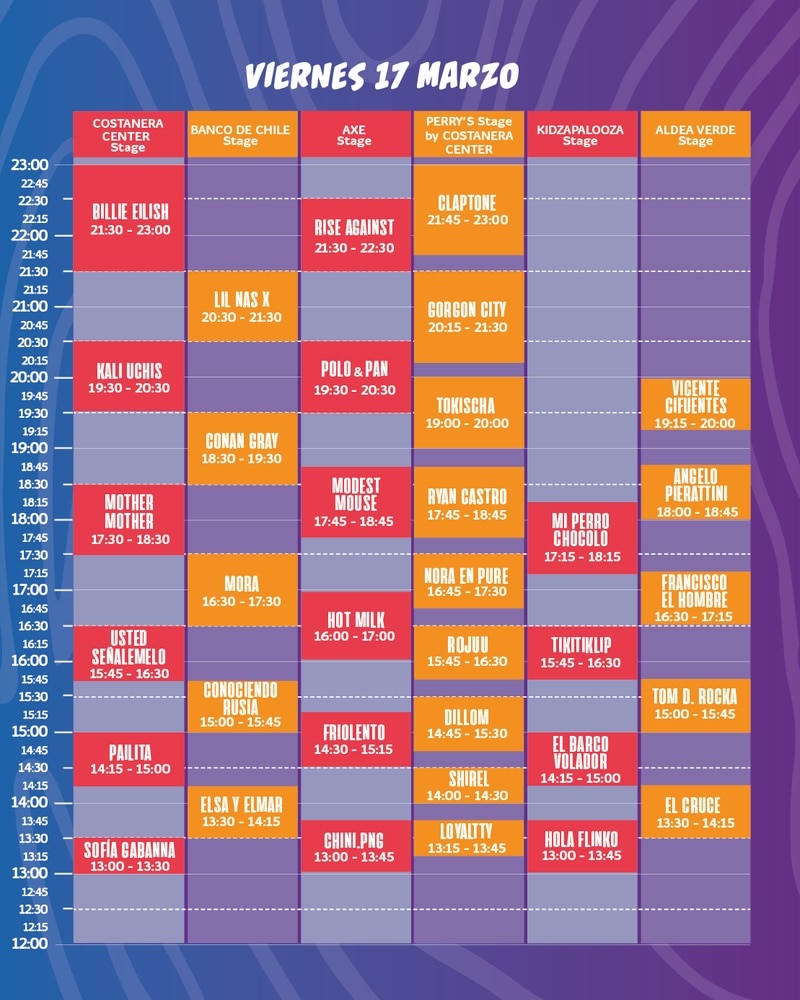 Billie Eilish será la encargada de cerrar la jornada del viernes 17 de marzo del 2023. La cantante se presentará a las 21:30 horas en el Costanera Center Stage, como la carta principal del primer día. Se espera que el show dura cerca de una hora y media, por lo que debería terminar a eso de las 23:00 horas.