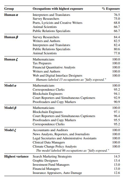 “Las ocupaciones enumeradas en esta tabla son aquellas en las que estimamos que GPT y el software basado en GPT pueden ahorrarles a los trabajadores una cantidad significativa de tiempo para completar un gran parte de sus tareas. Pero no necesariamente sugiere que sus tareas puedan ser completamente automatizadas por estas tecnologías“, aclaran en el estudio.