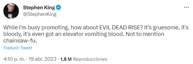 Ahora, el autor quedó encantado con Evil Dead Rise (Evil Dead: El Despertar), la nueva entrega en la icónica saga de terror. "Es horripilante, es sangrienta, incluso tiene un ascensor vomitando sangre", escribió King en sus redes. Esto, en referencia a una escena que le hace homenaje a una de sus historias, El Resplandor.