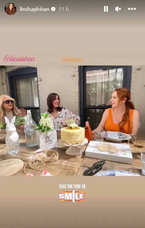 En la imagen subida por la actriz a sus historias de Instagram, se la puede ver en conjunto a su madre Dina Lohan y su hermana Aliana. Las tres comparten en lo que parece ser una mesa llena de regalos para la futura madre e hijo.
