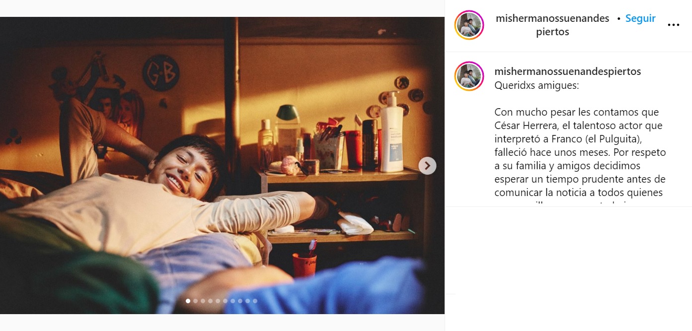A través de sus redes sociales, el equipo de la película Mis Hermanos Sueñan Despiertos comunicó el lamentable fallecimiento de César Herrera. Una noticia que impacta y enluta al cine nacional, que pudo disfrutar de su talento hace solo un tiempo.