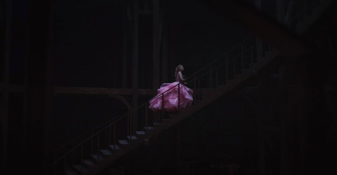 La primera es de Cynthia Erivo caracterizada como Elphaba. Ahí se le puede ver con su clásico atuendo negro y la piel de color verde esmeralda. En la segunda se ve a Ariana Grande como Glinda, subiendo una gran escalera con un vestido de color rosa.