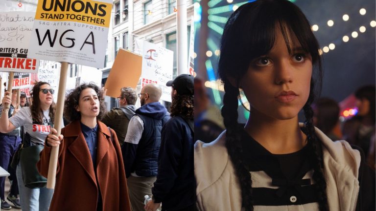 A través de redes sociales, se viralizaron carteles donde se ve a guionistas manifestándose y haciendo referencias a Jenna Ortega. Esto, luego de que la actriz confesara ser "poco profesional" y cambiar los guiones sin preguntarle antes a los escritores.