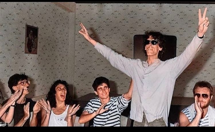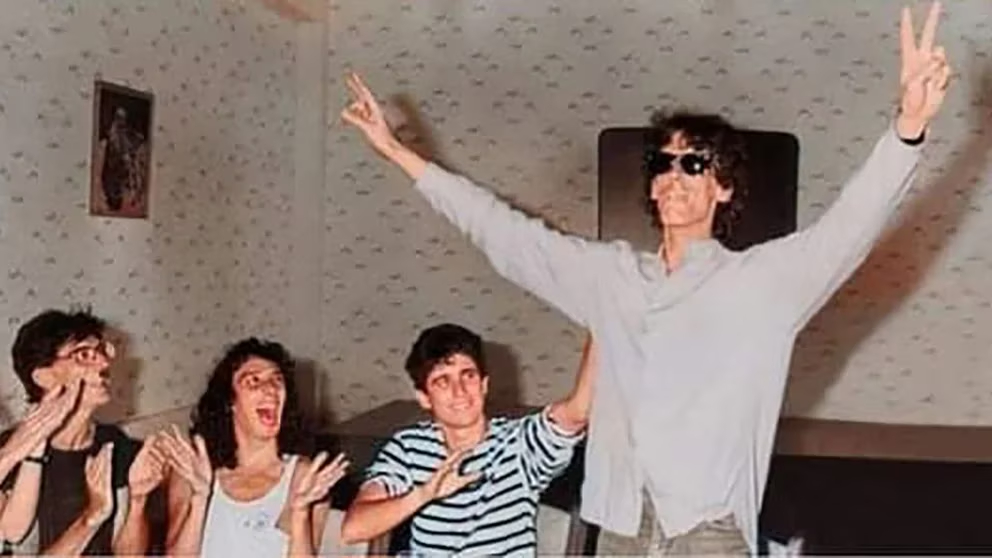 Sin embargo, para los que no conocen la icónica fotografía original, tomada por Andy Cherniavsky, a la izquierda del "Flaco", aparece otra figura igual de importante que el resto en la foto León Gieco.