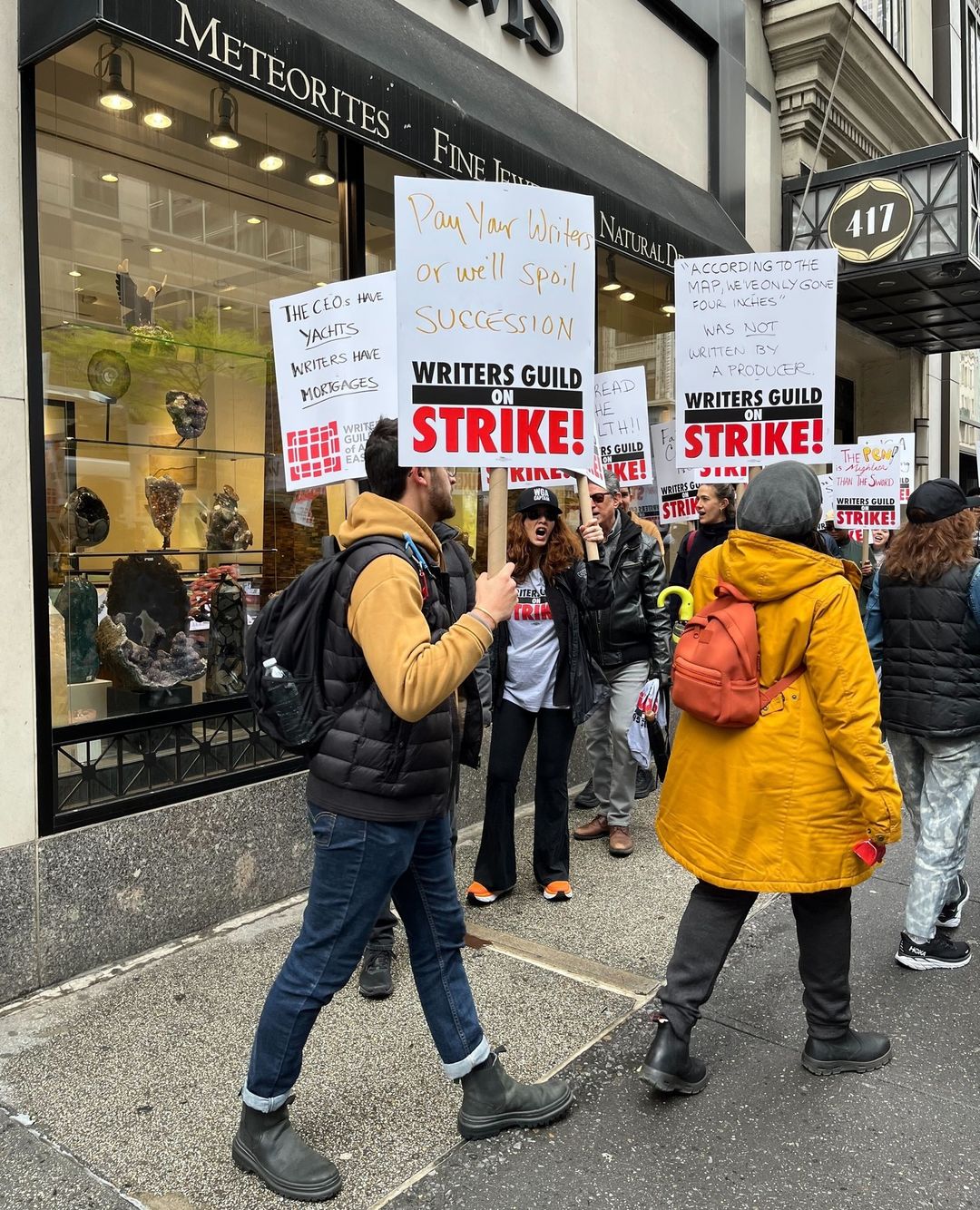Entre los letreros había varios mensajes ingeniosos, entre ellos, "'Lo que tenemos aquí es una falla en la comunicación' NO fue escrito por un productor", en referencia a la película "Cool Hand Luke". "¿Qué haría Larry David?", "Paguen a los nerds un salario justo, ” “NO estamos en 'Severance' (Separación)”, “Paguen a sus escritores o spoilearemos 'Succession'” entre otros, se leía en la manifestación.