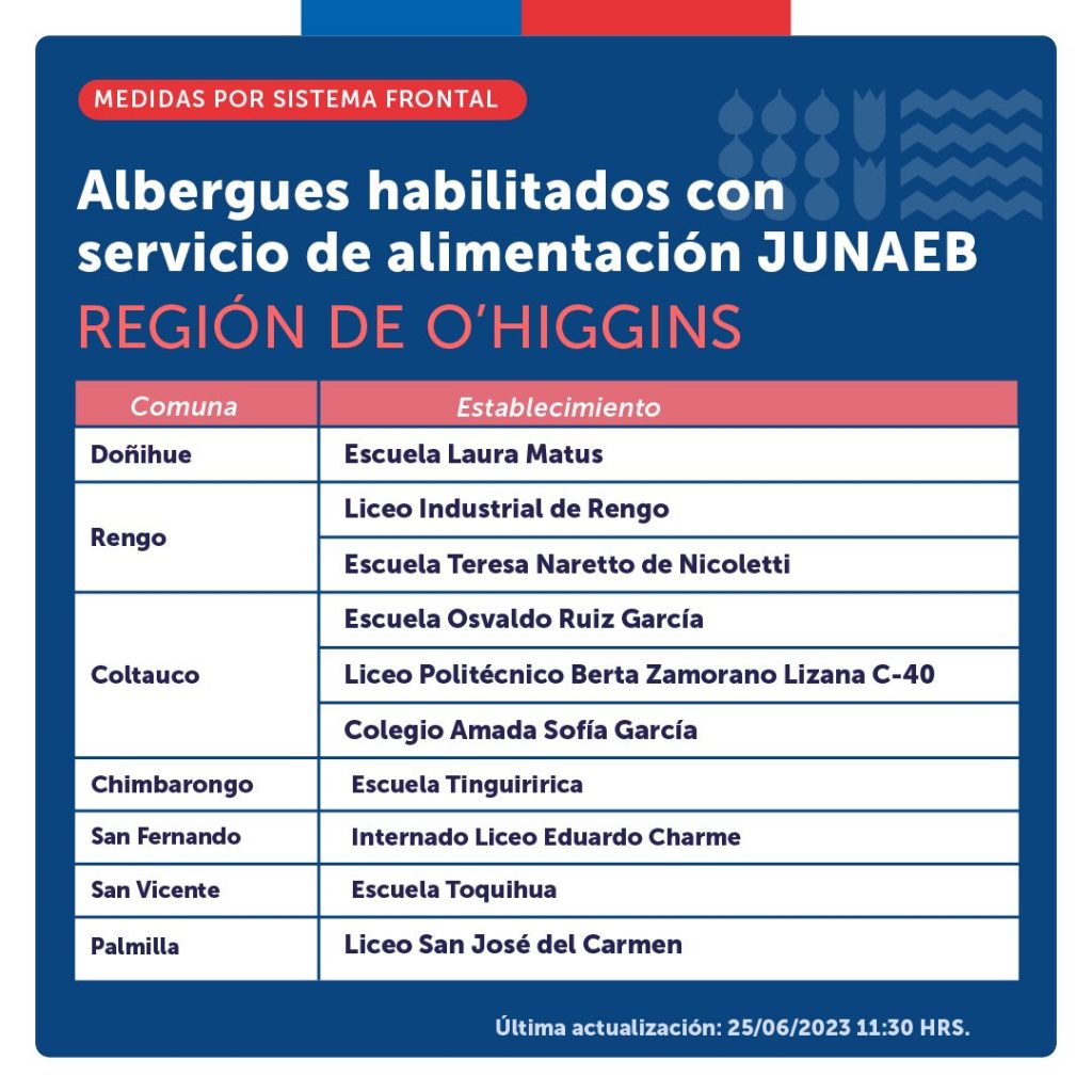 En varios de estos espacios, la Junta Nacional de Auxilio Escolar y Becas (JUNAEB) activó una red para entregar servicios de alimentación a personas afectadas y brigadistas.