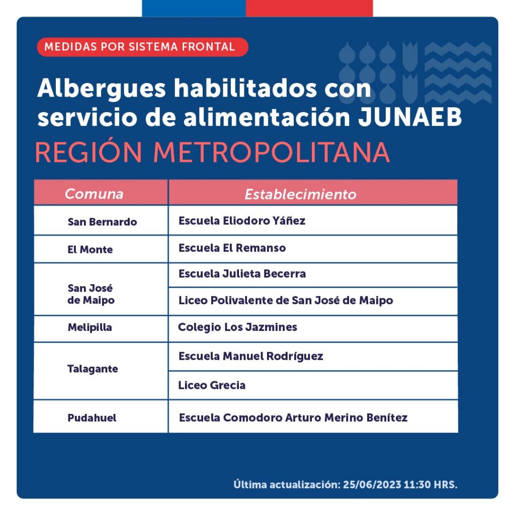 En la Región Metropolitana, los albergues habilitados con sistema de alimentación JUNAEB están en: