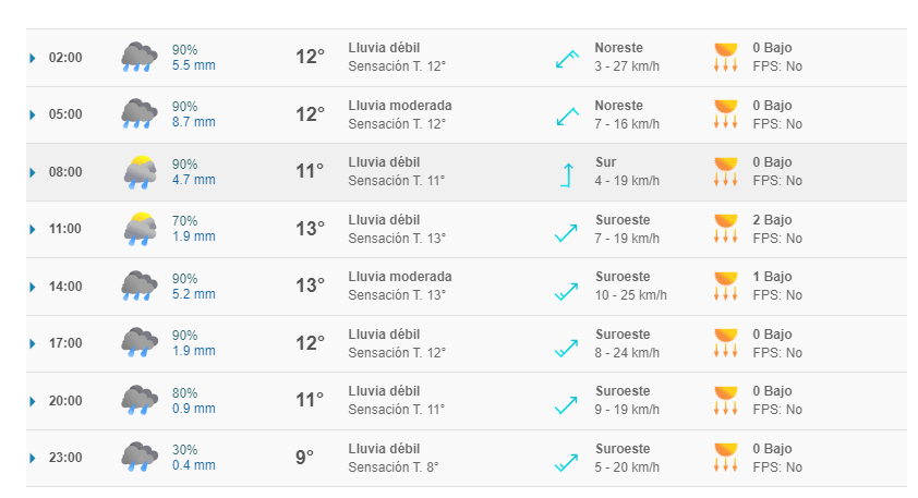Asimismo, este día las temperaturas oscilarán entre 8°C y 14°C durante el dia, cuya máxima se alcanzará sobre las 13:00. A lo largo del día, prevalecerá el viento moderado de suroeste, con rachas que podrán llegar hasta 28 km/h.