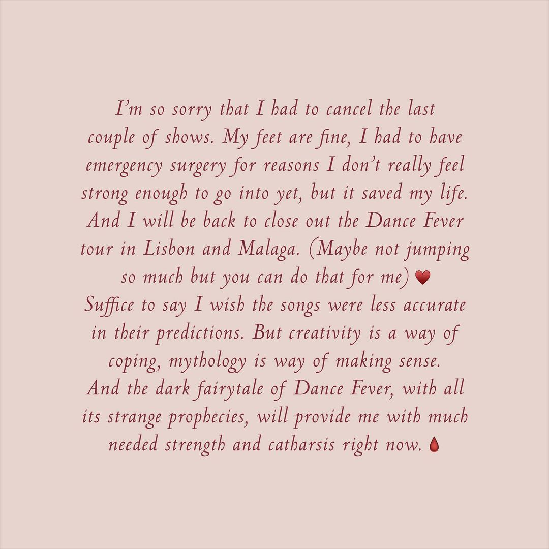 Cabe recordar que Florence + The Machine se encuentra en medio de lo que ha sido una gira mundial para promocionar su más reciente álbum de estudio, Dance Fever. Sin embargo, la gira ha enfrentado algunas dificultades debido a los problemas de salud de su líder y voz.