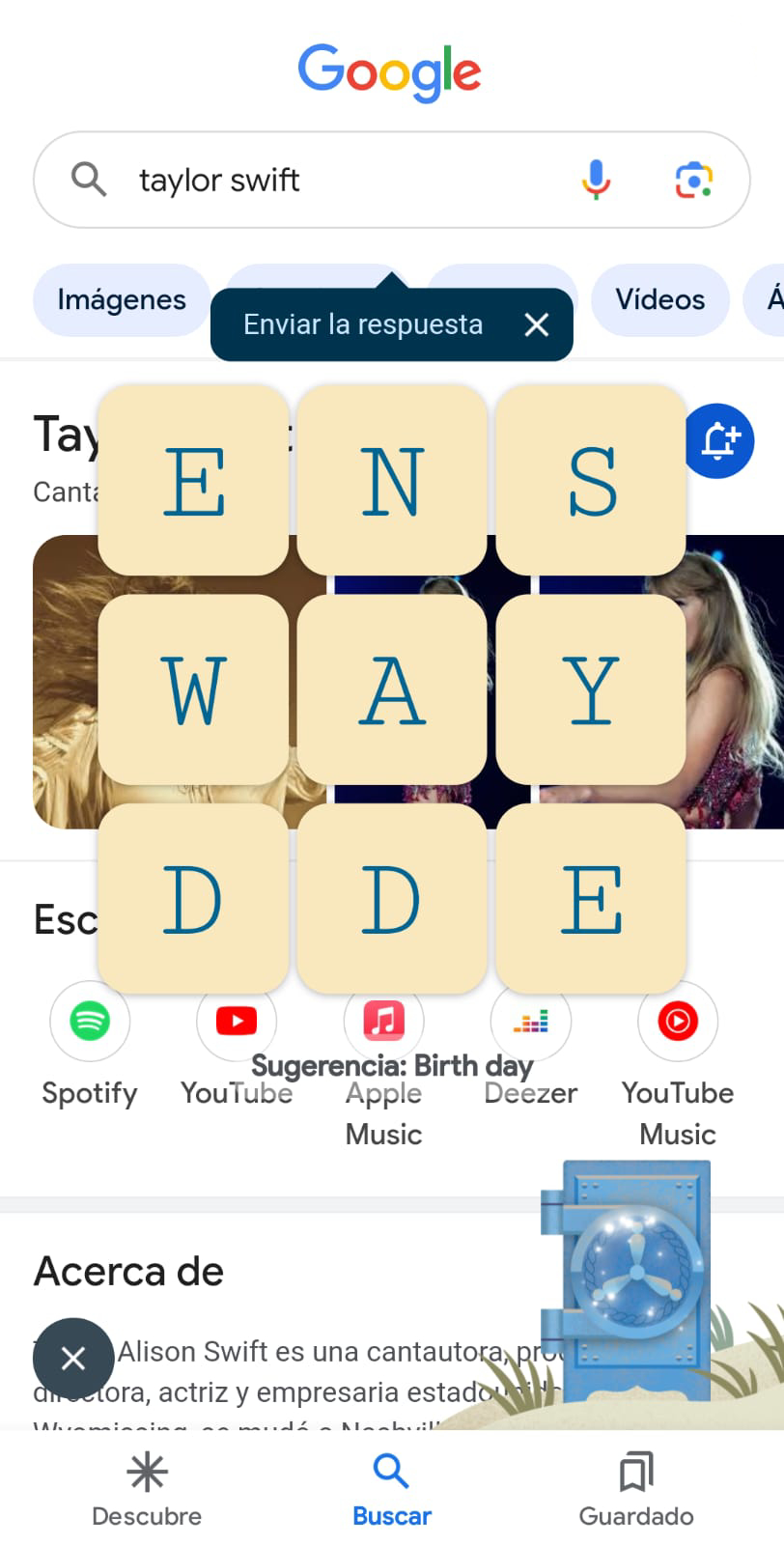 La forma en que puedes contribuír a la búsqueda es escribir “Taylor Swift” en el buscador de Google. Al hacer esto, debería aparecer una bóveda en la esquina inferior izquierda.