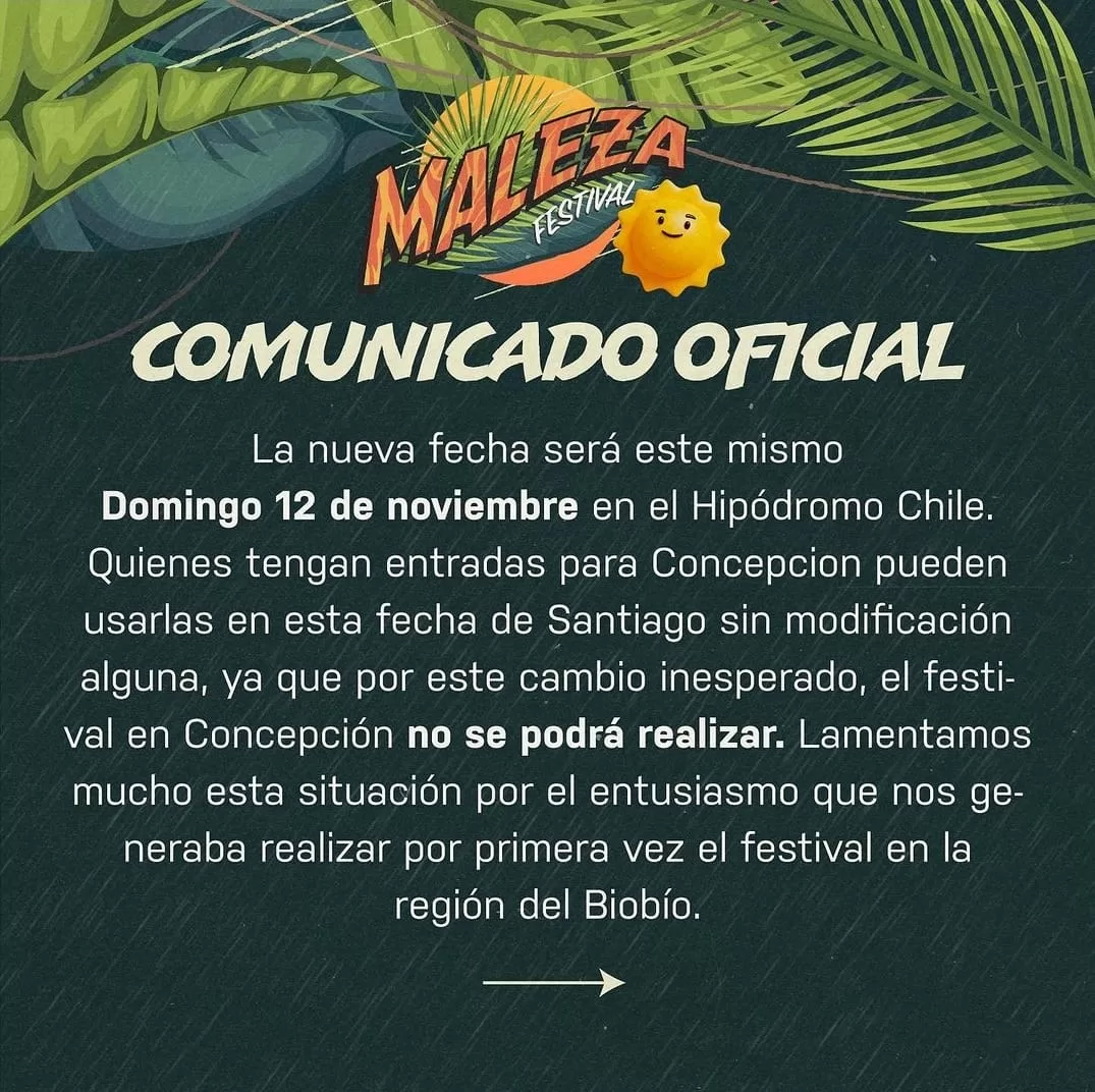 Sumado a esto, también tuvieron que cancelarlo definitivamente de Concepción, el cual se iba a hacer el domingo 12 de noviembre.