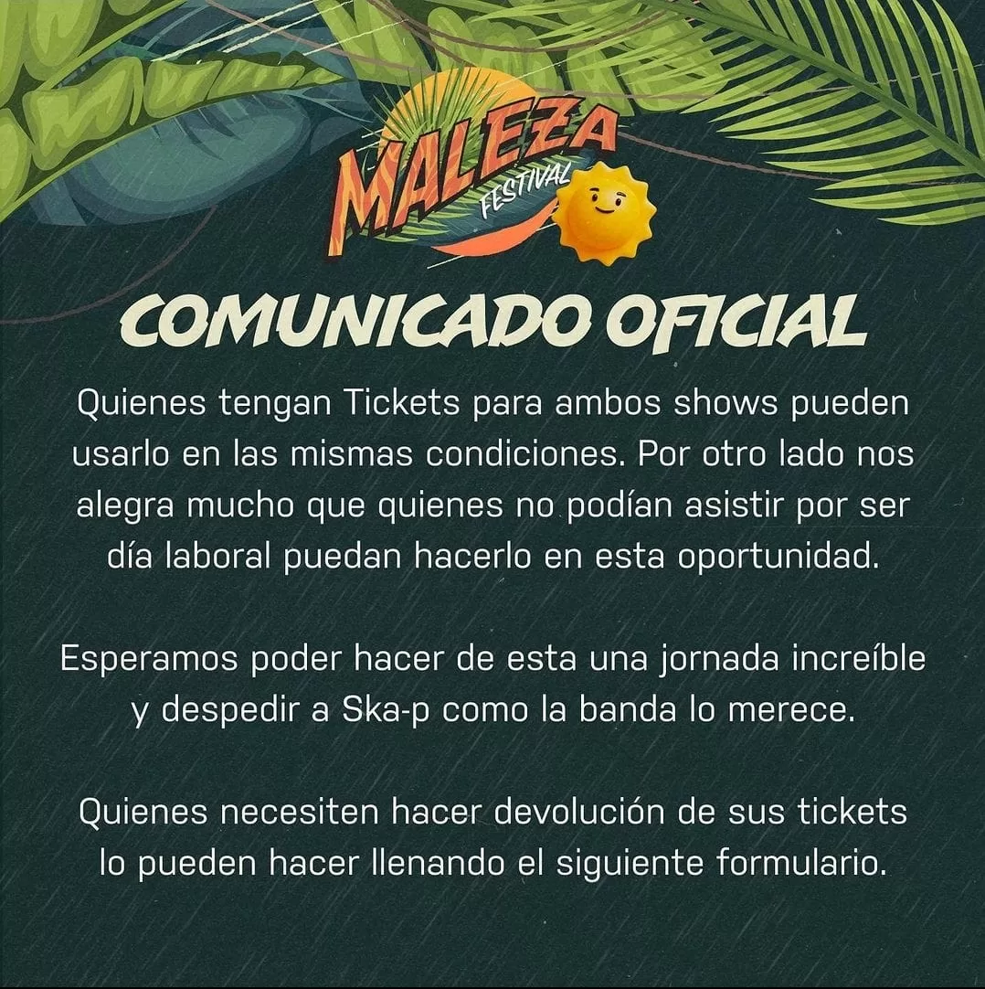 Los tickets son válidos para el domingo en Santiago (Tanto los de la capital, como los de Concepción). Quienes deban devolver sus entradas por no poder asistir el domingo, podrán hacerlo en un link que la productora proporcionará en la cuenta de Instagram del Festival Maleza